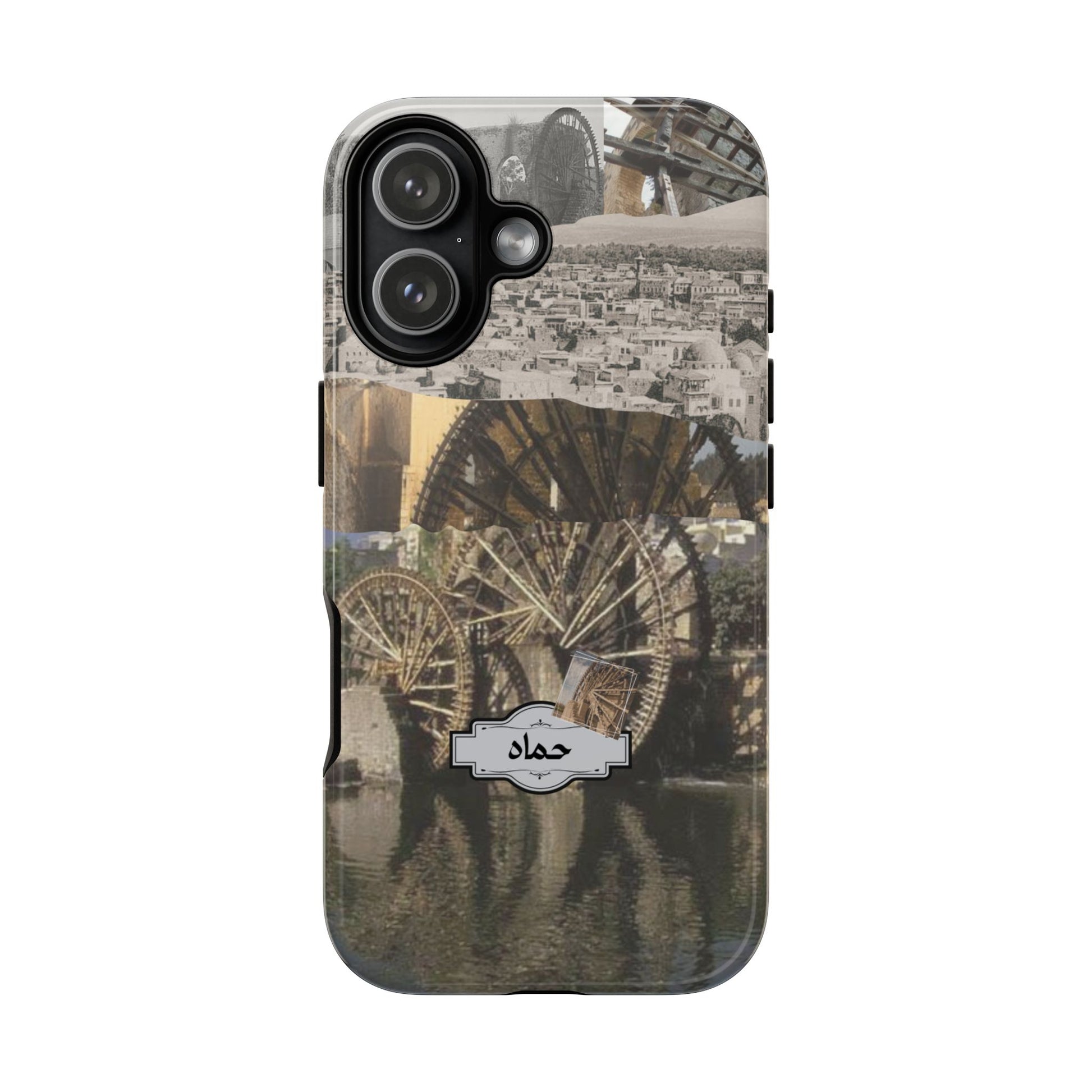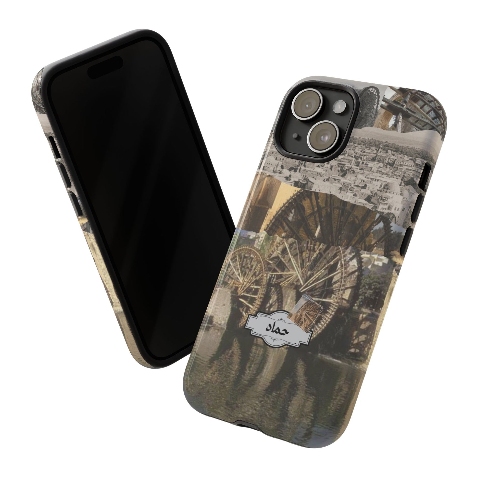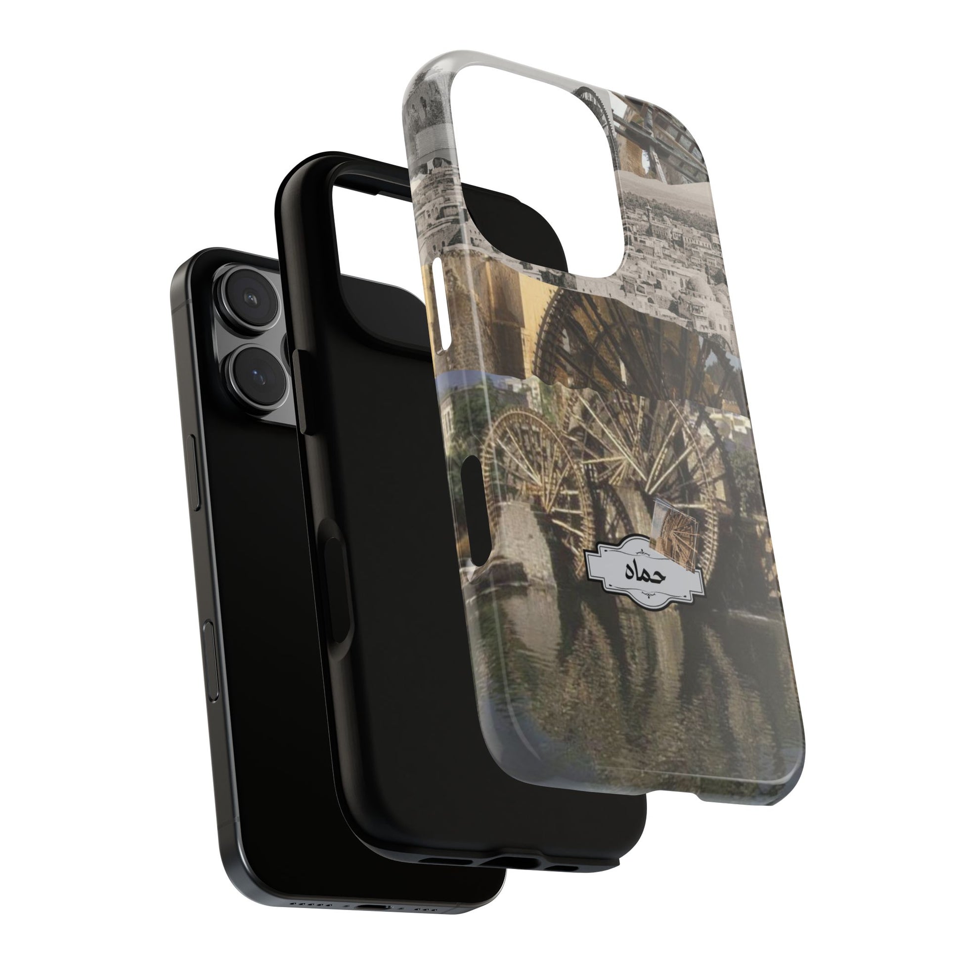 Embrace the essence of Hama, Syria, with this phone case designed to reflect the city's unique heritage. It showcases the iconic Norias, the majestic water wheels that stand as a symbol of ancient innovation. The case is adorned with a monochrome vista of Hama's historic architecture, evoking the city's enduring spirit. Accented with elegant Arabic calligraphy, this phone case is more than a protective accessory—it's a statement of cultural pride and a portable homage to Syrian landmarks.