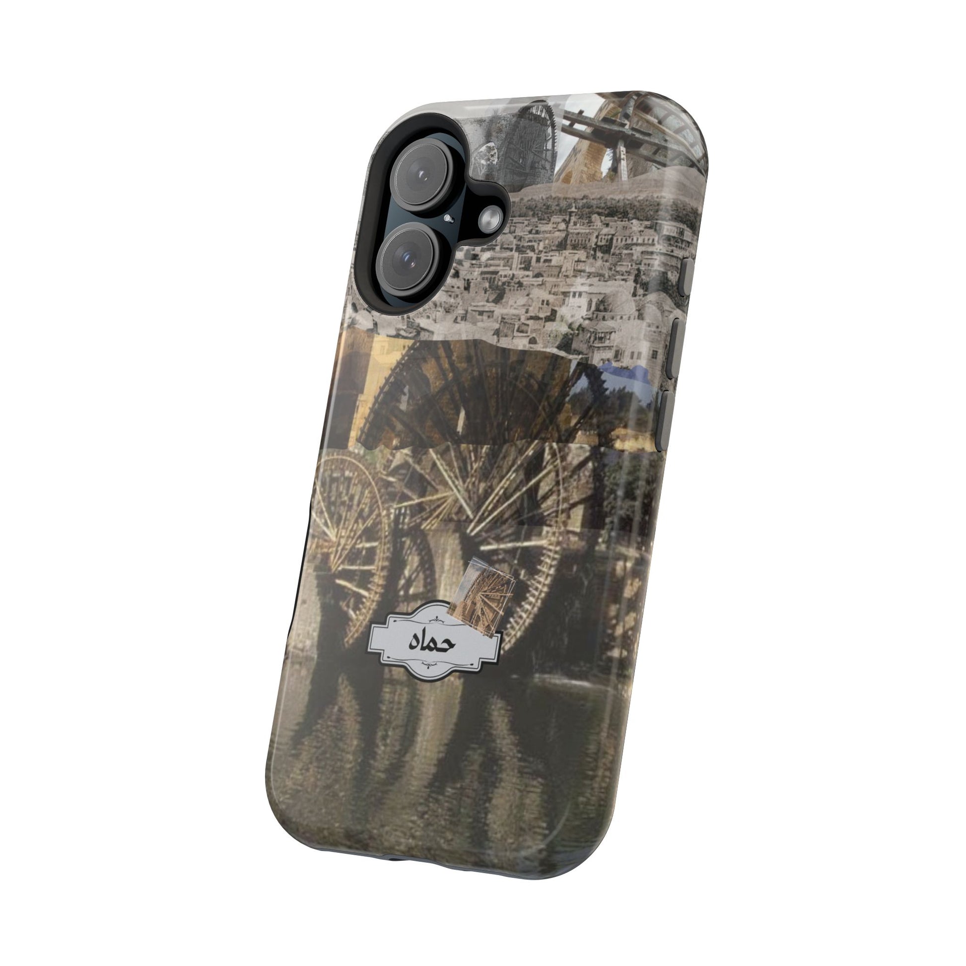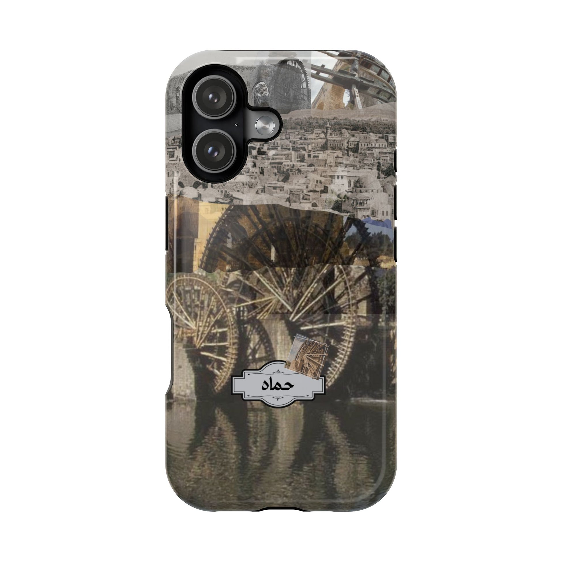 Embrace the essence of Hama, Syria, with this phone case designed to reflect the city's unique heritage. It showcases the iconic Norias, the majestic water wheels that stand as a symbol of ancient innovation. The case is adorned with a monochrome vista of Hama's historic architecture, evoking the city's enduring spirit. Accented with elegant Arabic calligraphy, this phone case is more than a protective accessory—it's a statement of cultural pride and a portable homage to Syrian landmarks.