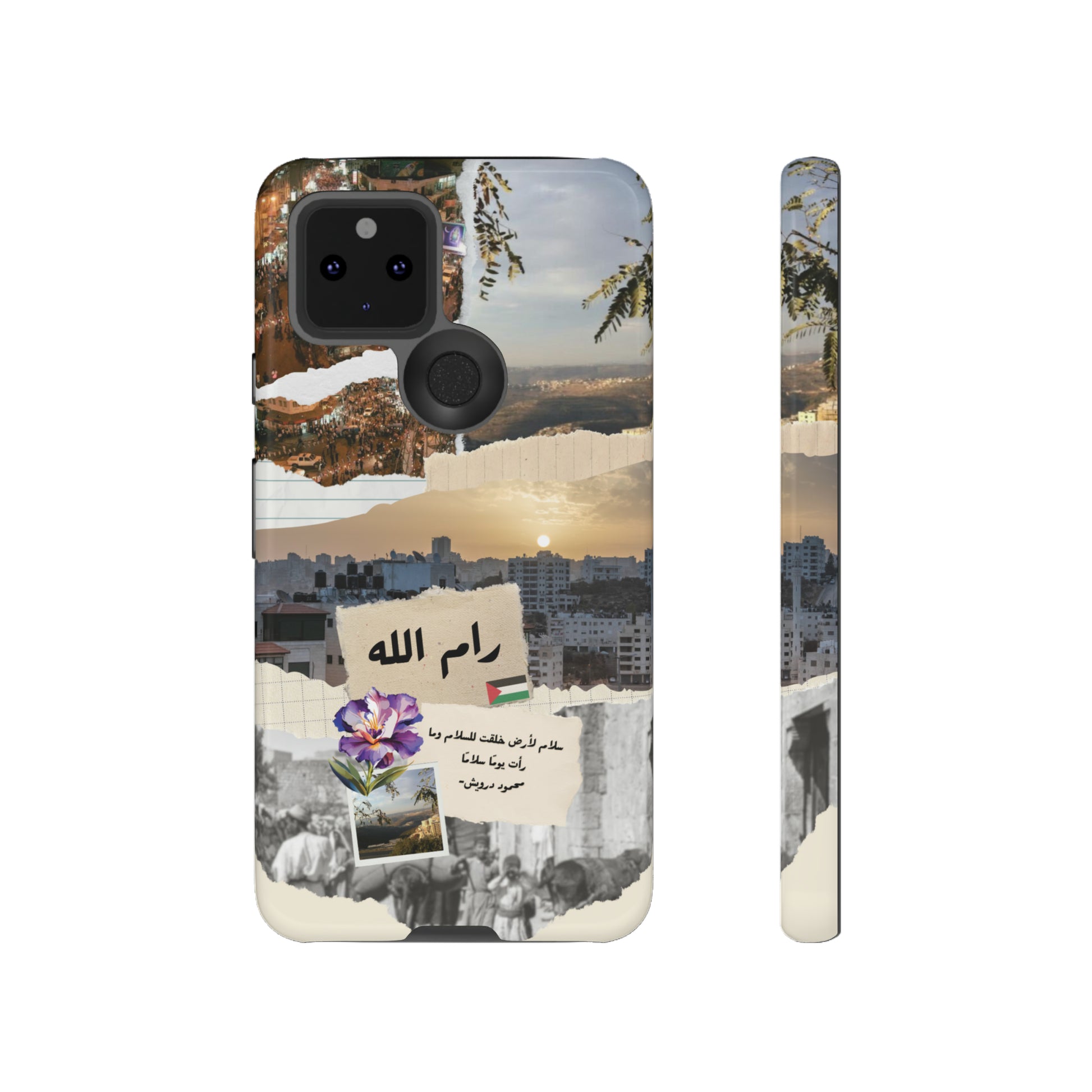 Carry a piece of Ramallah's soul with our "رام الله" phone case, a thoughtful montage that captures the essence of this Palestinian city. From our Cities Collection, this case features a harmonious mix of protection and artistry, celebrating Ramallah's urban landscape and cultural vitality. The case highlights its name in Arabic calligraphy, along with the Palestinian flag, evoking national pride. Visuals of the cityscape at dusk, historical black-and-white photos of people and daily life, and the iris, Palestine's national flower, come together to create a narrative that's both historical and heartwarming—a tribute to Ramallah's dynamic spirit and resilient beauty.