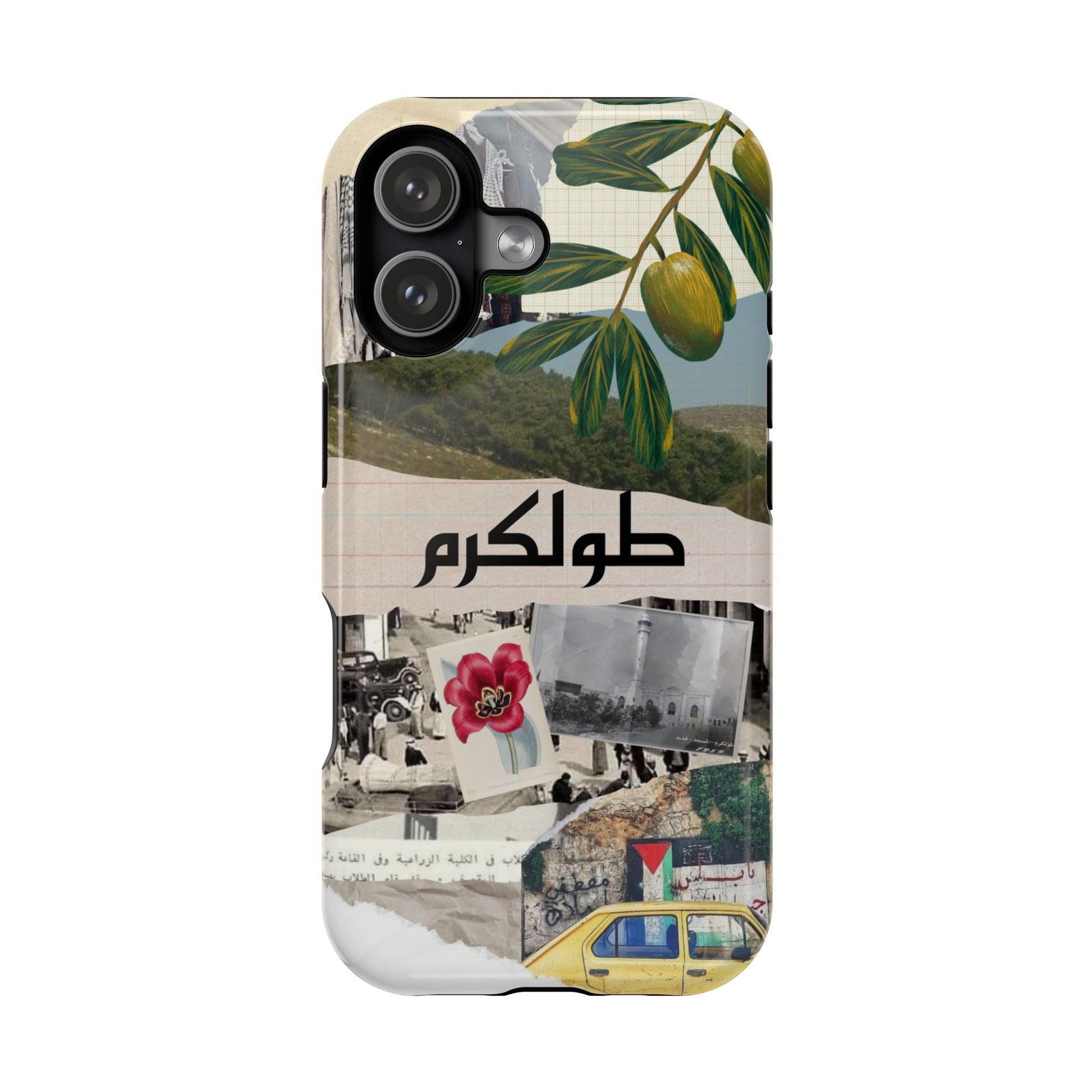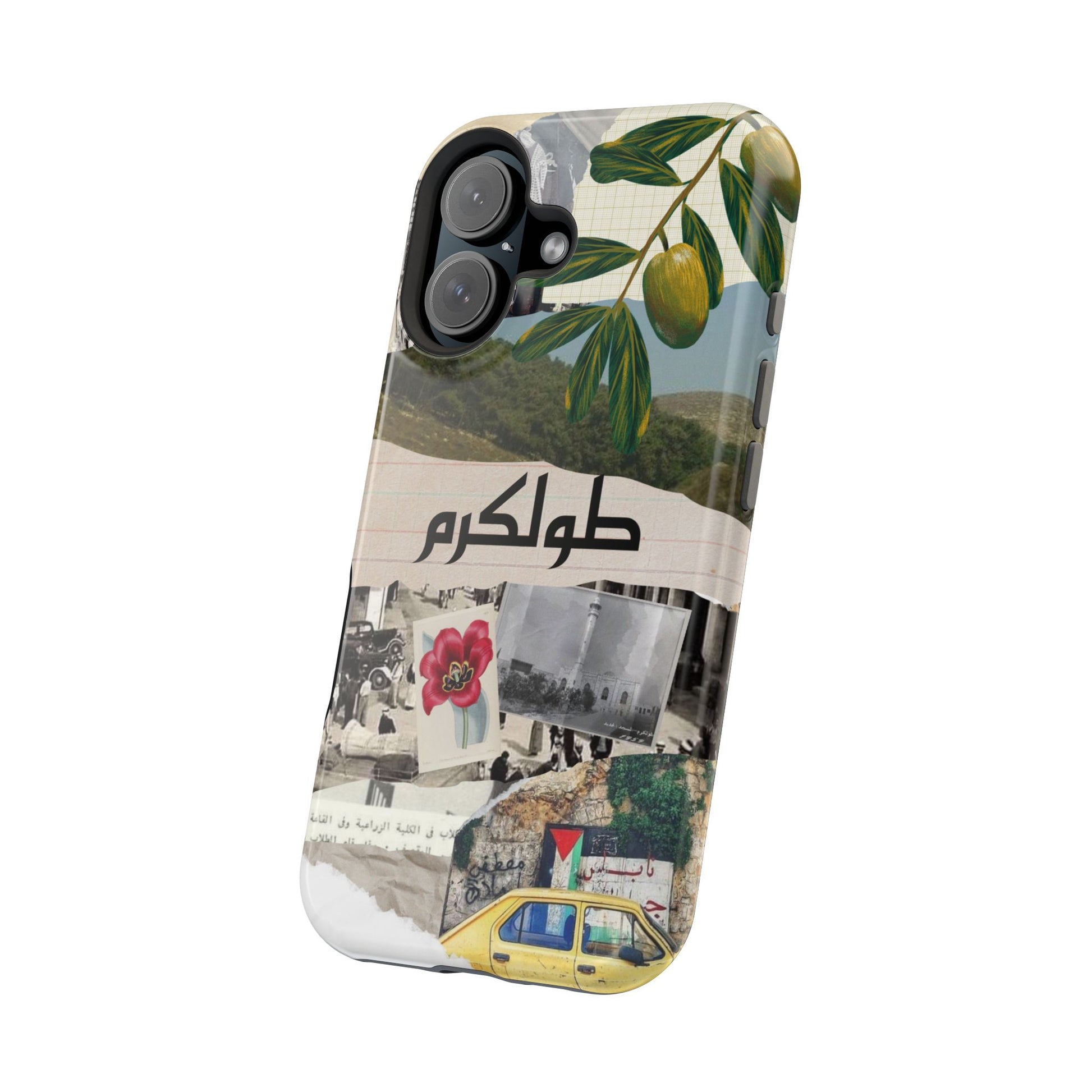 The طولكرم (Tulkaram) phone case, is a vibrant composition that honors the spirit of this cherished city in Palestine. This case, a proud part of our Cities Collection, tastefully blends dependable protection with a visual narrative of Tulkarm's identity. It features the Arabic script of Tulkarm at the top, images of lush green olive branches, a symbol of peace and prosperity significant to Palestinian culture, and a collection of black-and-white photographs that depict the city's historical architecture, bustling markets, and the iconic yellow taxi—a staple of urban life in the region. This case is not just an accessory, but a portable mural of Tulkarm's enduring legacy and vibrant contemporary life.