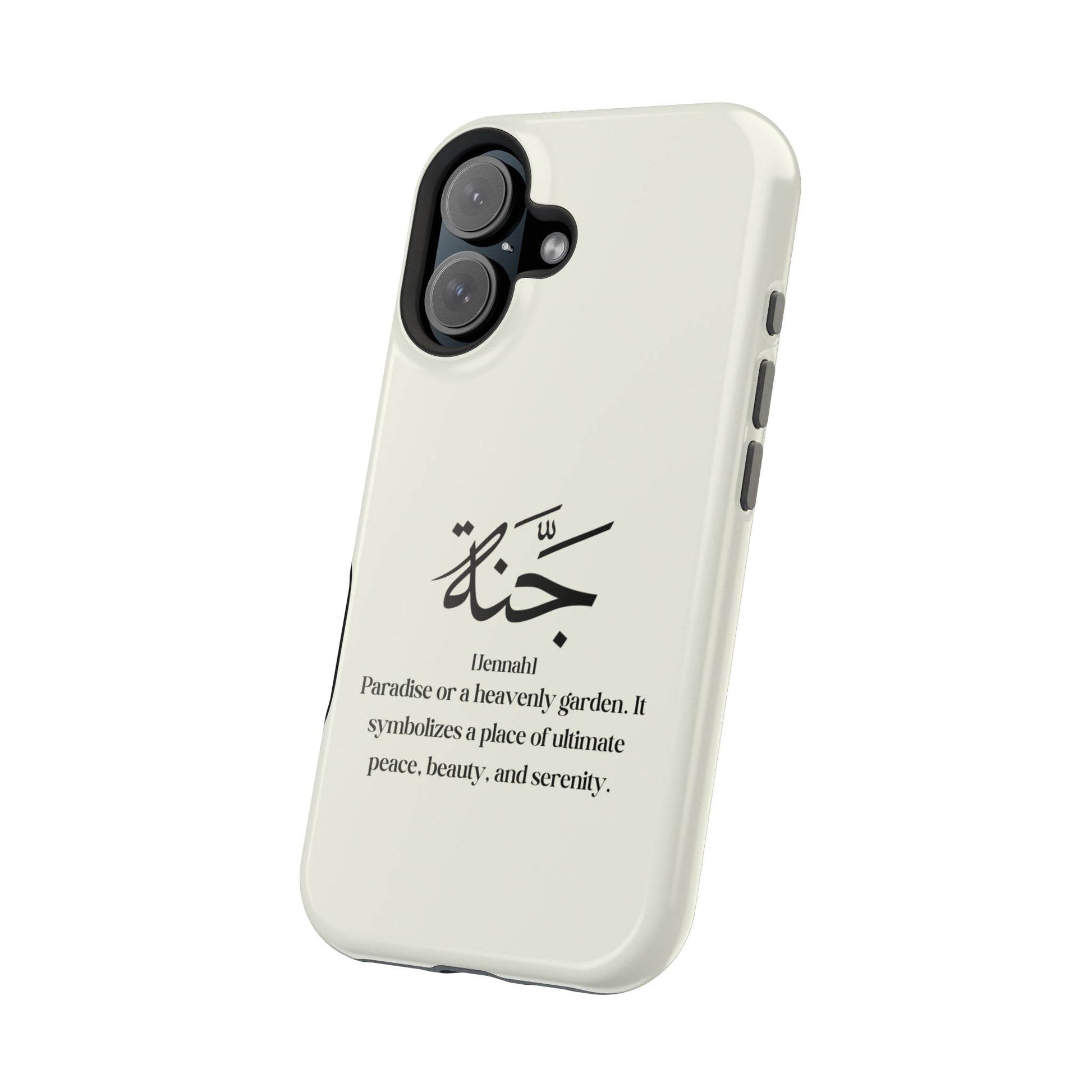 Elevate your daily routine with our Jennah phone case, it’s in paradise green 😉 and adorned with the Arabic word "جنة" (Jennah) in elegant calligraphy. Below the inscription, an abstract and heartening definition serves as a daily reminder to strive for paradise in both the spiritual and earthly realms. Crafted from premium materials, this case is both a protective shell for your phone and a sanctuary for your soul. It's not just an accessory; it's a personal manifesto. Perfect for those who seek depth and beauty in their everyday items.