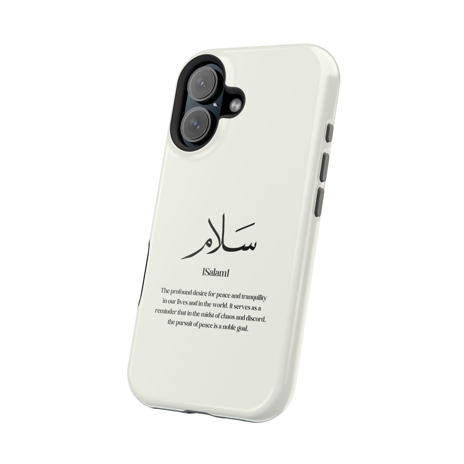 Infuse tranquility into your daily life with our Salam phone case, in a misty sage color it’s elegantly adorned with the Arabic word "سلام" (Salam) in intricate calligraphy. Below the inscription, the word's abstract and uplifting definition serves as a daily nudge towards peace and harmony. Made from premium materials, this case offers not just style but also robust protection for your phone. It's more than an accessory; it's your daily dose of serenity. Perfect for those who value both aesthetics and inner peace.