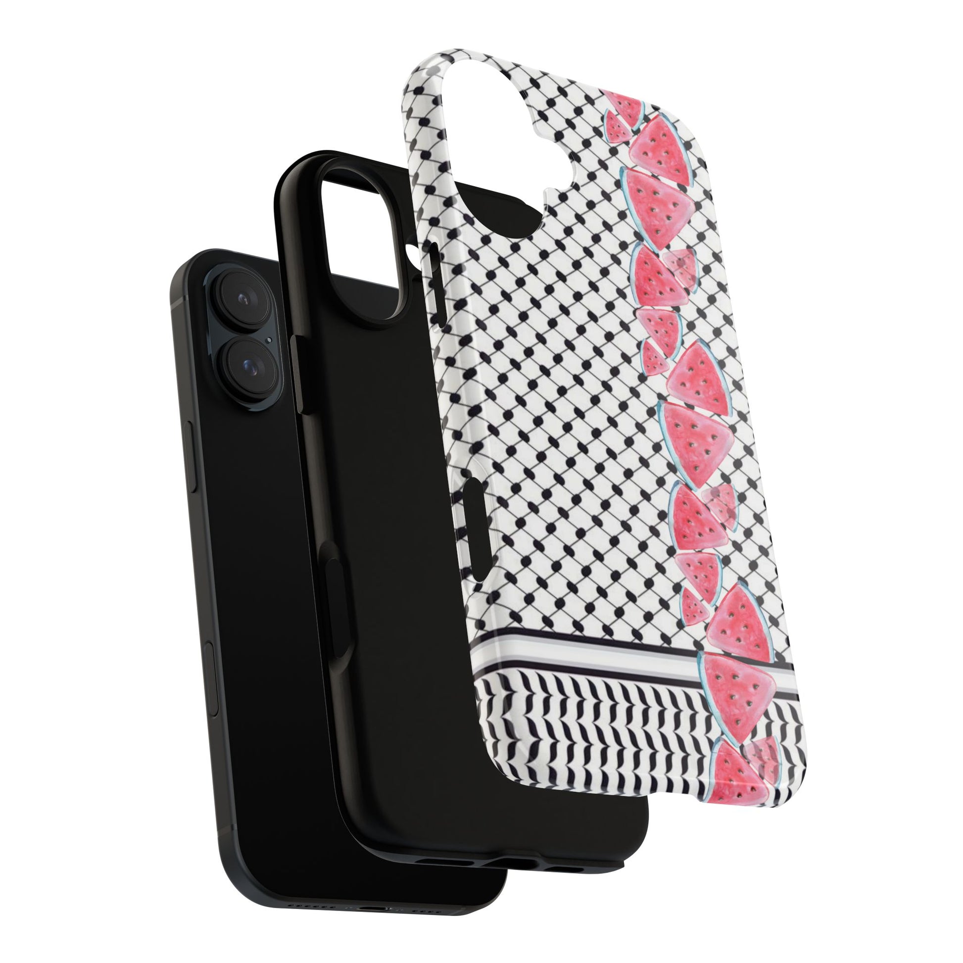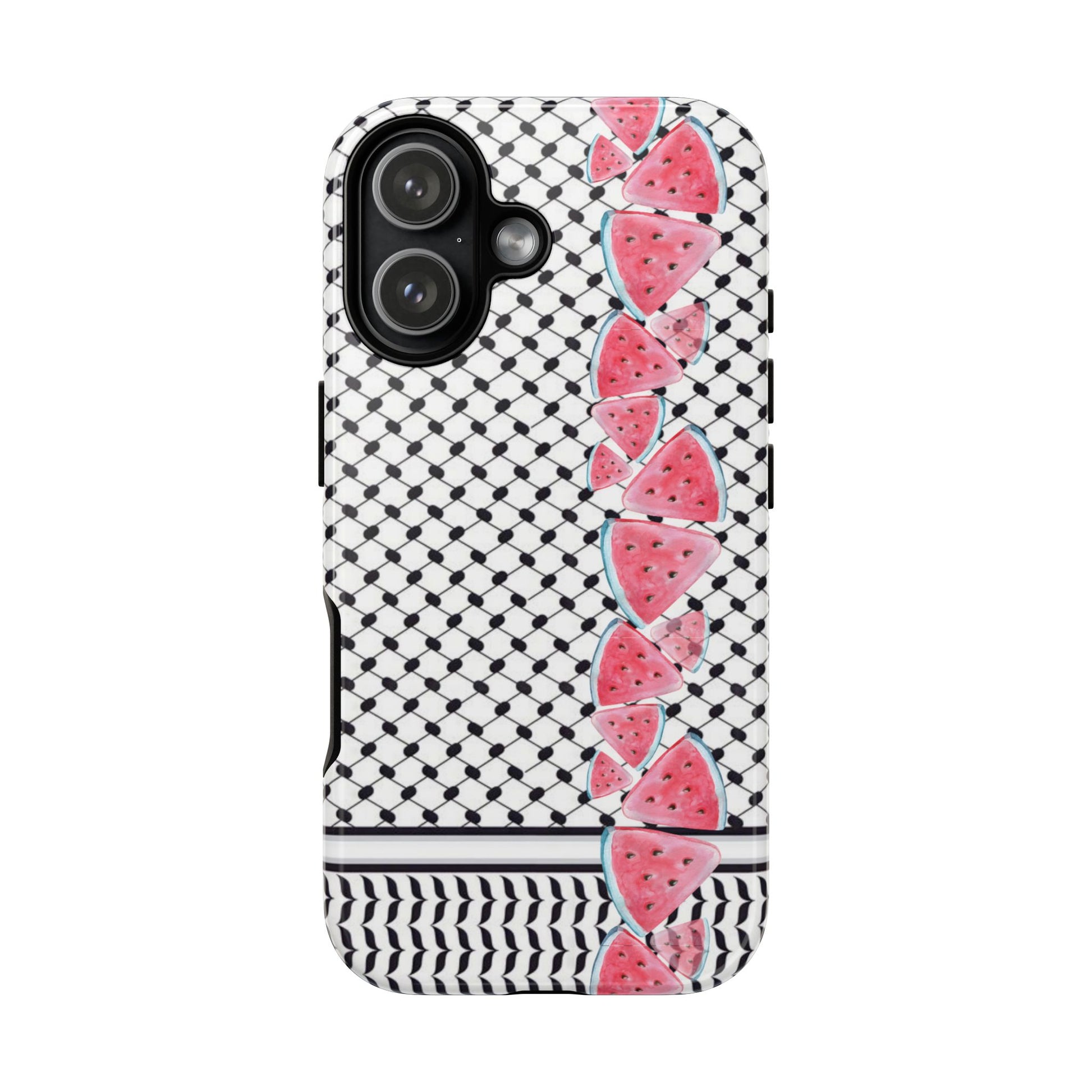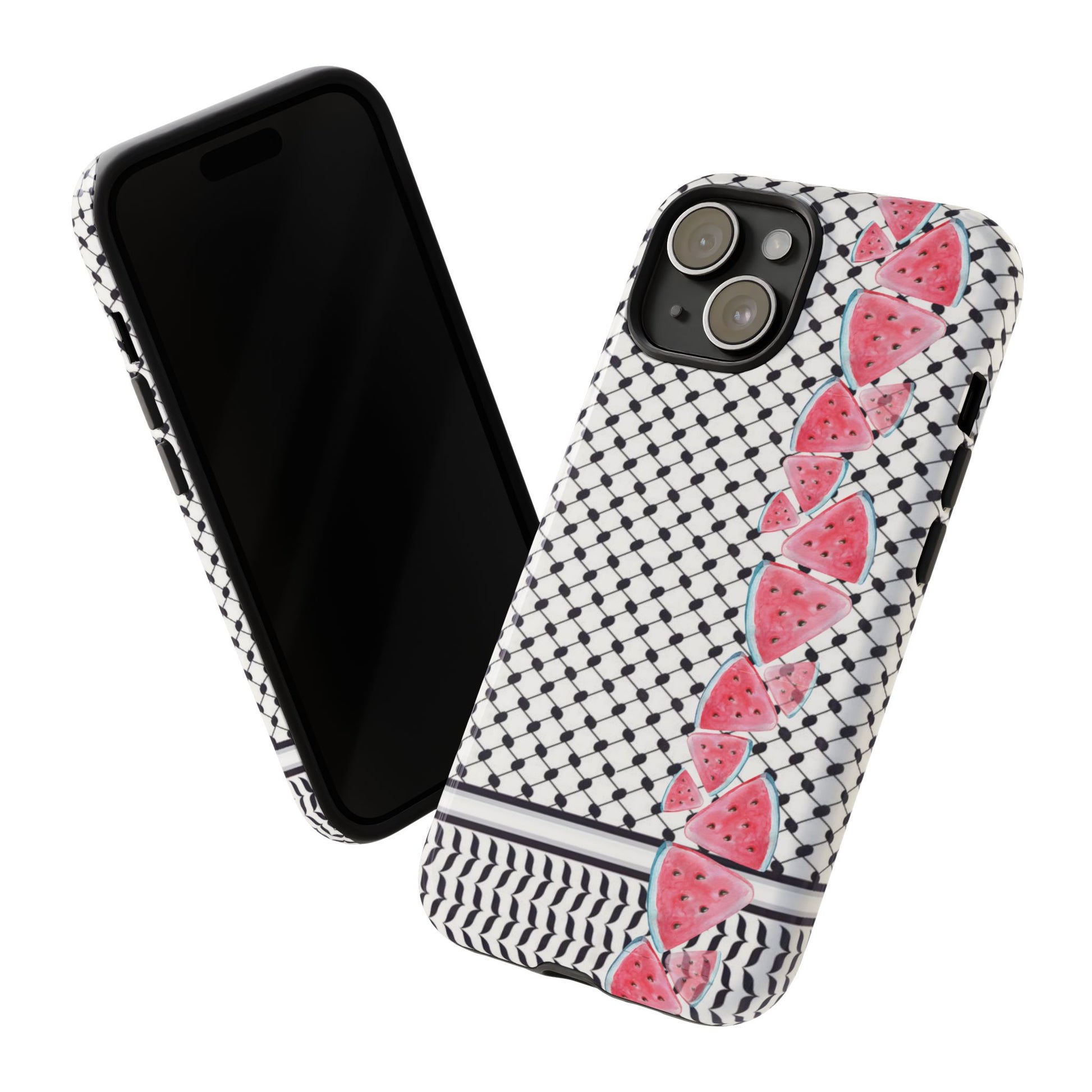 Our “Seeds of Resistance” case seeks to represent the spirit of Gaza and Palestine through its intricate kuffiyeh and watermelon patterns, 2 profound symbols of Palestinian identity and perseverance. The interlacing black-and-white motif reflects the rich textile heritage and the enduring strength of the Palestinian people. The watermelon slices, with their resilient rinds and sweet, vibrant flesh, serve as a metaphor for the Palestinian experience—tough through adversities yet rich in culture and life.