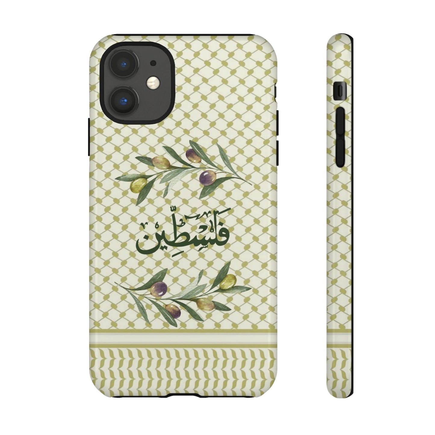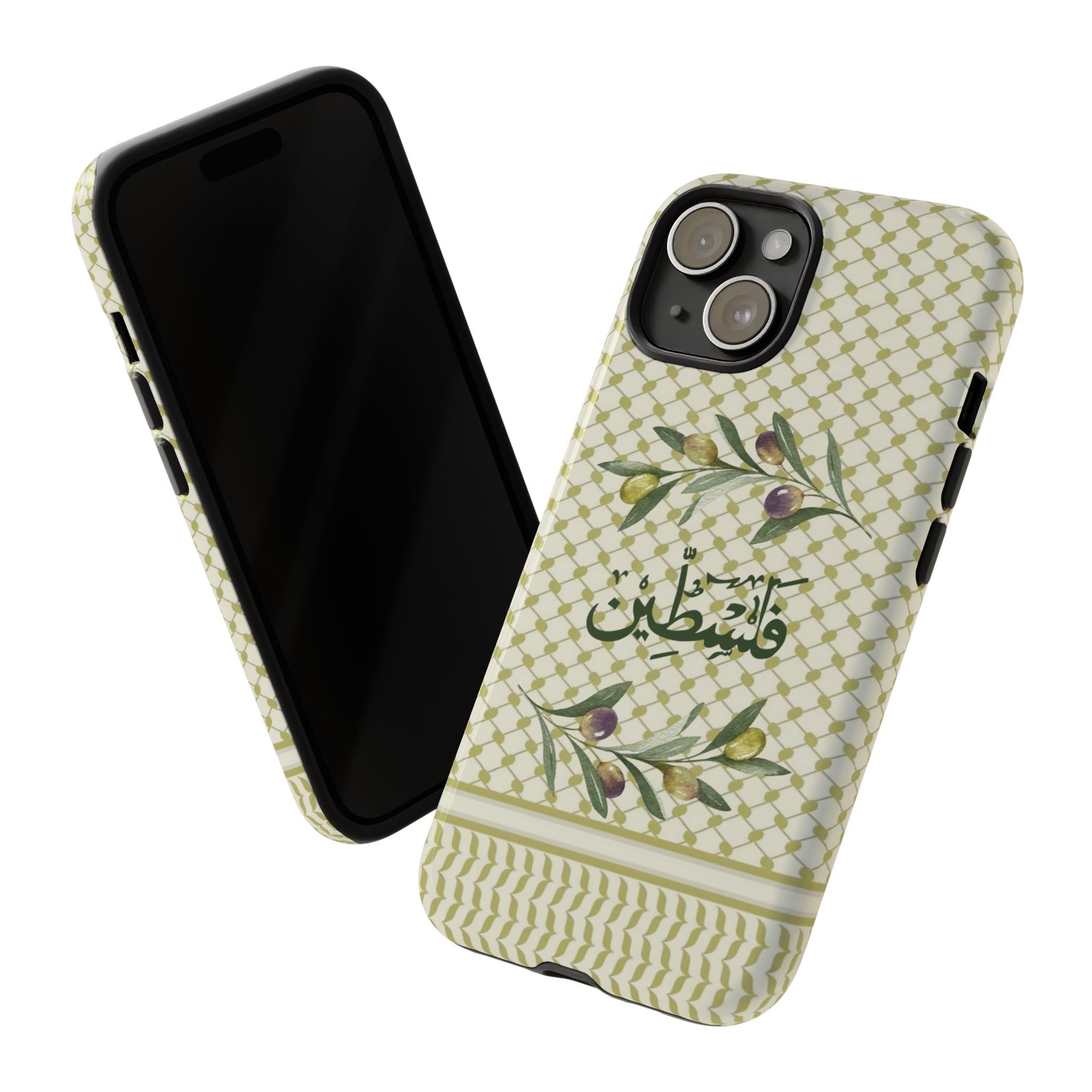 This design is infused with the essence of Palestinian heritage, featuring the timeless beauty of the olive branch, a symbol of peace and connection to the land. The Arabic script "فلسطين" translates to "Palestine," underscoring the theme of national pride. Set against a backdrop of a delicate, geometric pattern reminiscent of the iconic Palestinian kuffiyeh, the case reflects a deep respect for the artistry and historical significance of the region. The olive branch, with its ripe fruit and silvery leaves, not only represents peace but also the importance of olive trees in Palestinian agriculture and identity, evoking a sense of home and resilience.